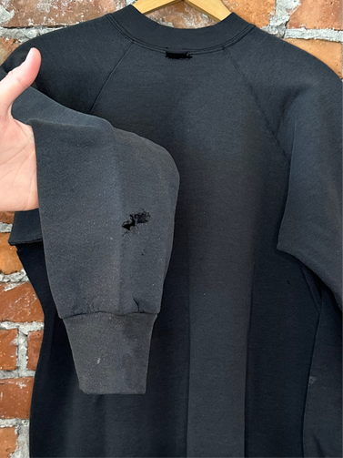 flaws: minor stain/fade on front, major staining on sleeves, holes on sleeves and back of collar.