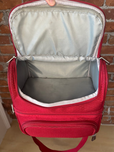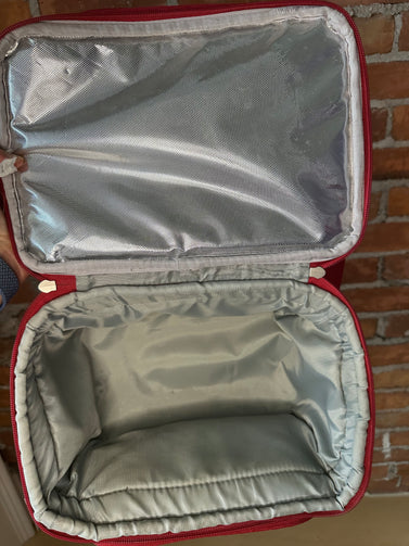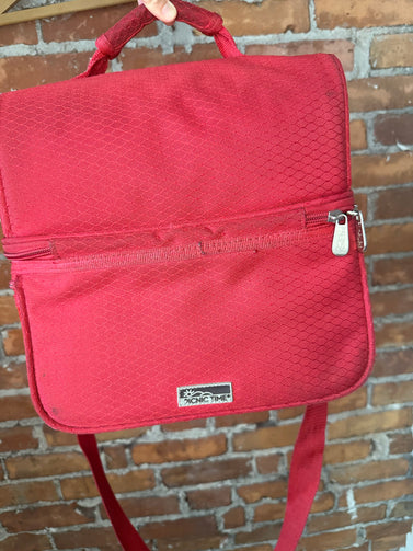 description: insulated lunch bag cooler, front pouch includes Original salt & pepper shaker/napkin/cutlery